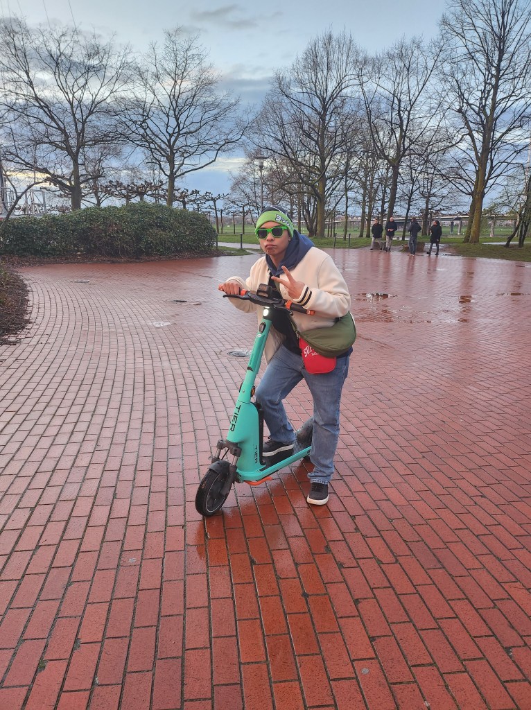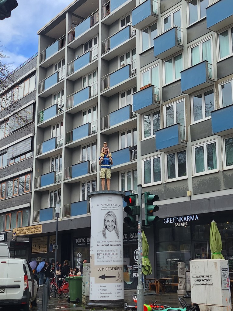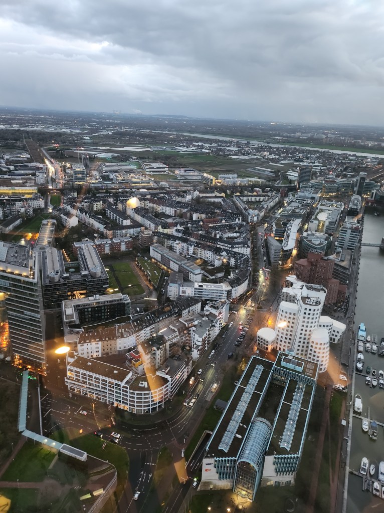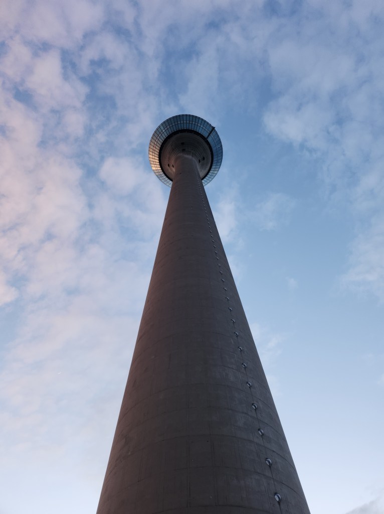 We headed towards the Rheinturm (also known as the Rhine Tower) after the rain died down, and along the way, we passed through Schadowstraße and the Altstadt, which had a variety of shops to look around (including a UNIQLO!). After a decent walk (and a little bit of city scooter action), we finally reached the ginormous tower that stood in front of us.