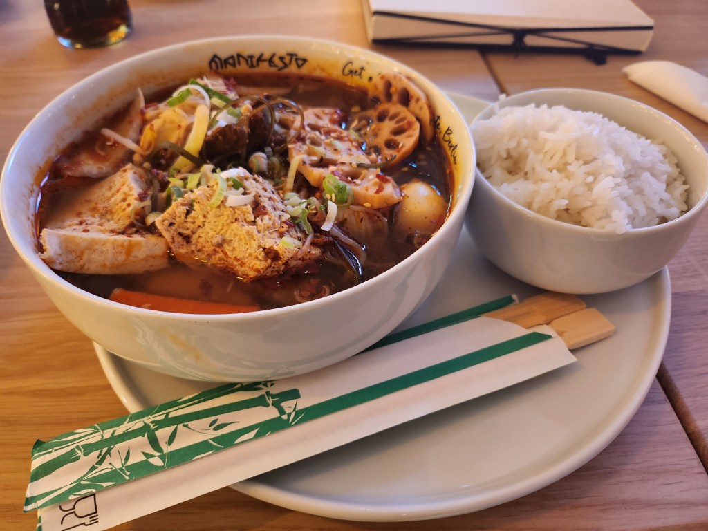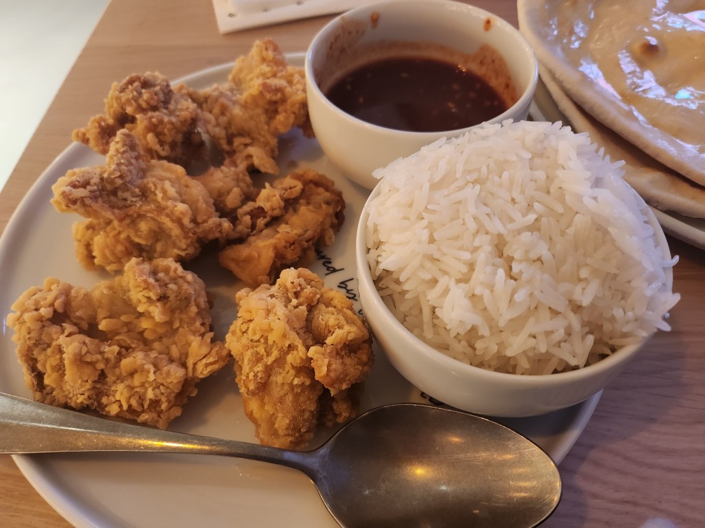 Located in “The Playce”, a pretty fancy mall with an equally fancy name, the Manifesto Market Berlin is a very cool food court (I love how it has a very sociable and relaxing vibe to it!) that offers a great variety of cuisines from around the world. We opted for South Korean, Chinese, and Indian dishes that day, so we ordered a large order of Korean Fried Chicken from Chi Kin, a packed bowl of Hot Pot from Mao Zeit, and two very big orders of Garlic Naan from Moksa.