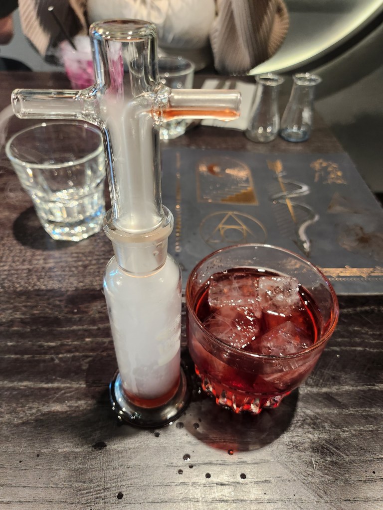 Looking for some magic to spice up our rather mundane lives, we went to the Alchemist Berlin for some reality-bending concoctions! I had the Pressurized Choc-o-groni, the Edible One, and the Chase the Rainbow drinks (a “little afternoon drink session”, we said), and except for the last drink, each came with their own gimmick. The Pressurized Choc-o-groni had a very bitter and chocolatey taste, and the gimmick for this one was that covering the spout where the gas (science folks help me out with this one) comes out from with your finger would lead to the liquid rising from the vial and coming out from another spout… I think I explained rather poorly, so please take a look at the video below: