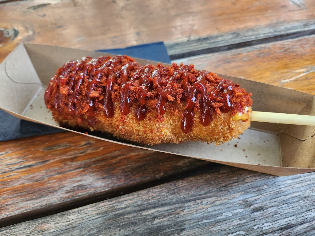 I got myself the Half & Half corn dog, which meant one half had cheese while the other half had sausage stuffed within, and obviously had the Flamin’ Hot version with the Korean Spicy Sauce for the toppings. It was film-a-TikTok-showing-the-cheese-pull levels of cheesy and it was so good! I would definitely come back to get some more corn dogs in the future with great eagerness if it didn’t take a seven hour ride to get to Berlin…