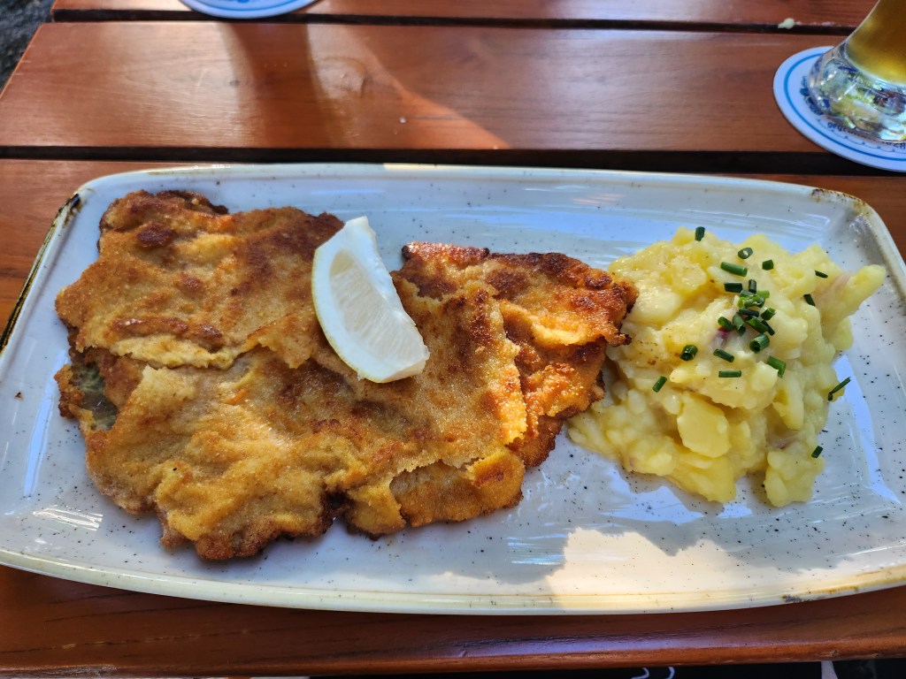 Last week I had the opportunity to dine at the famed Augustiner-Keller, a massive landmark restaurant in Munich that is packed to the brim with customers daily. Being in Munich, I had to try out their regional fare, so I ordered the Münchner Schnitzel, which was a simple and filling pork filet with a crisp layer outside. Squeezing the lemon slice on the schnitzel gave it a lovely fresh taste and also cut down the greasy feel, and the lemon-y flavor was complemented by the savory and somewhat sour potato salad that was served on the side.