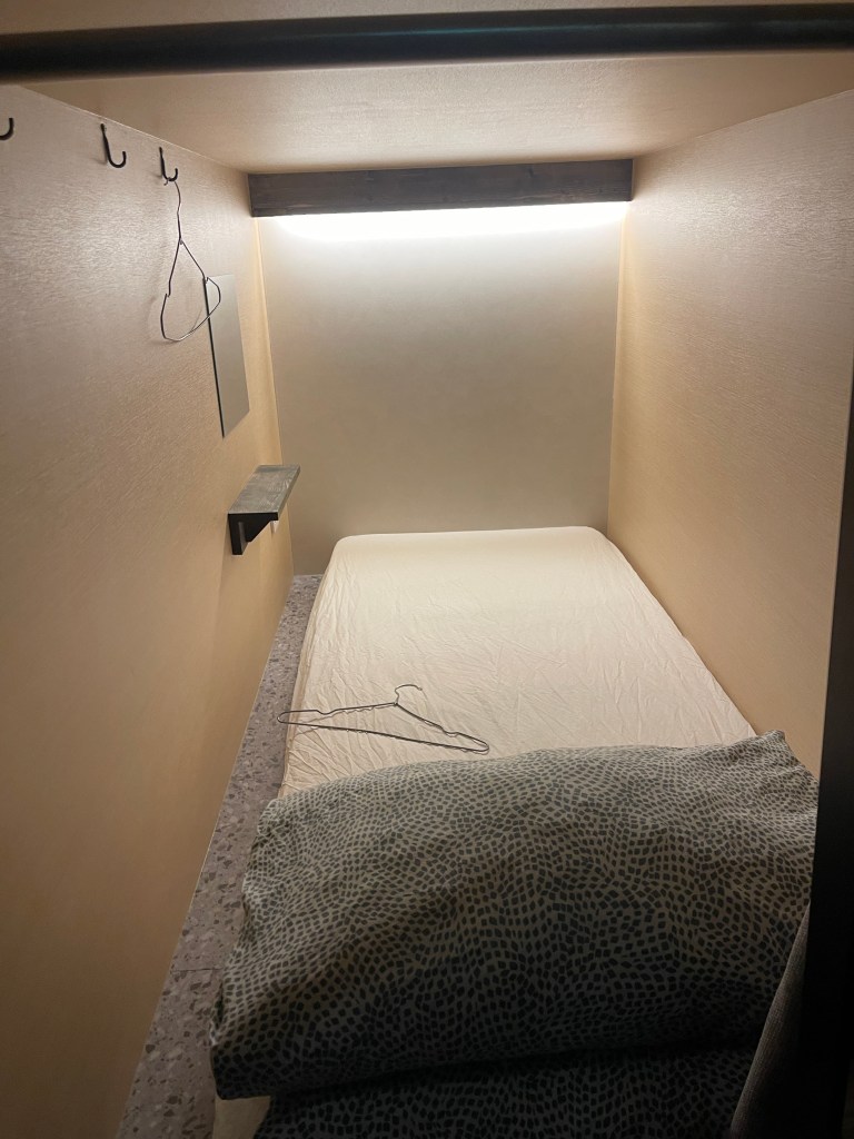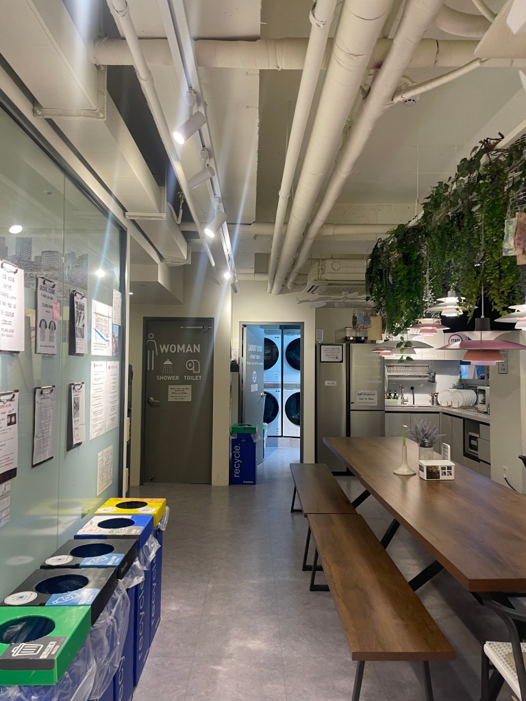 I then headed up to the men-only 6th floor and to my room cube, Cube 76, and I found out I got the bottom cube, which bummed me out a little because I love being on top (PAUSE). Before I went to retreat for the night, I did a nanosecond reconnaissance of the common area (there were too many people socializing for my socially awkward self), and it had a small kitchen space and a huge table that was big enough for many guests to share.