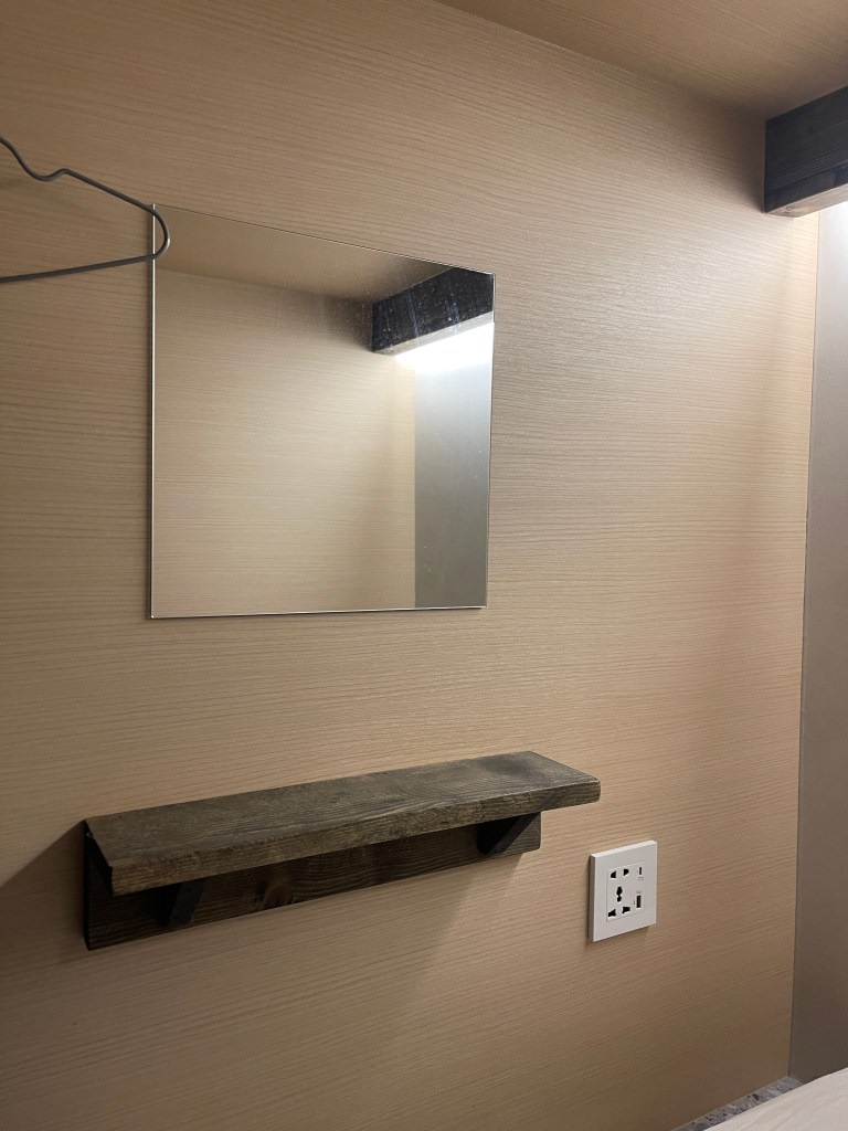 I was pleasantly surprised to find that the cube was more spacious than I thought, and it also offered hangers, a mirror, a floating shelf (is that what you would call it?) to put your stuff on, along with two outlets and USB ports.