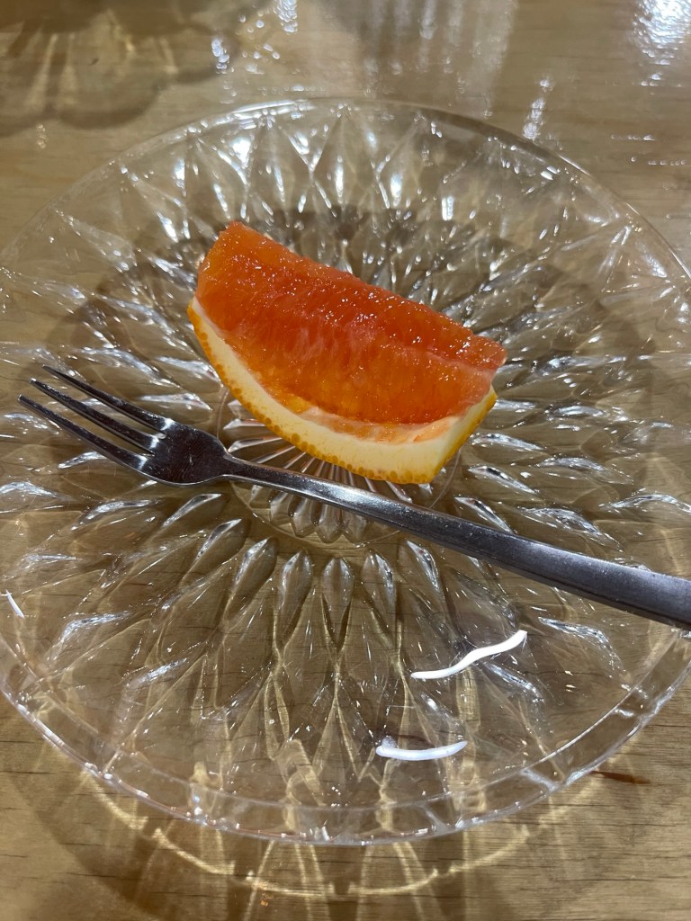 A chilled slice from a… fruit belonging to the citrus family (Writing this review has made me aware of how disgustingly unhealthy I am…) was served at the end as dessert, and it was wonderfully fresh and juicy and came off the skin so easily!