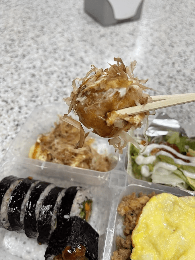 I began my lively dinner with the doughy, soft, and gushy Takoyaki and the Kimbap, which had a BBQ-like taste with a fantastic sauce. I’m not really a fan of perilla leaves, but they were great here!