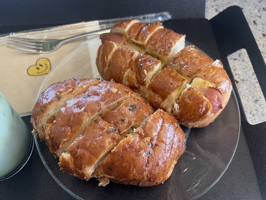 While I sipped on the smooth Iced Matcha Latte, which had the natural sweetness of the milk front and center and had a lingering aftertaste, I had the hot dog-like pastry and a sweet garlic bread roll as well (I forgot to note down their names…), which the cafe staff kindly had cut into bite-sized pieces (thank you!). The former was crisp and bread-y, with a sausage and cheese filling, whereas the latter was very sweet (garlic items tend to be on the sweet side here in South Korea), and the lovely garlicky taste left an aftertaste with every bite!